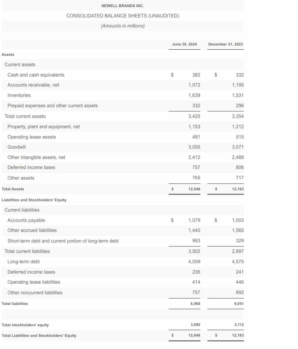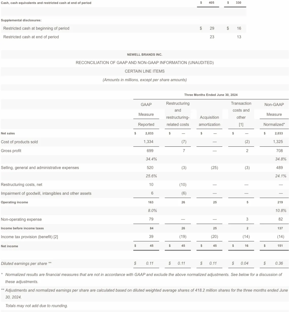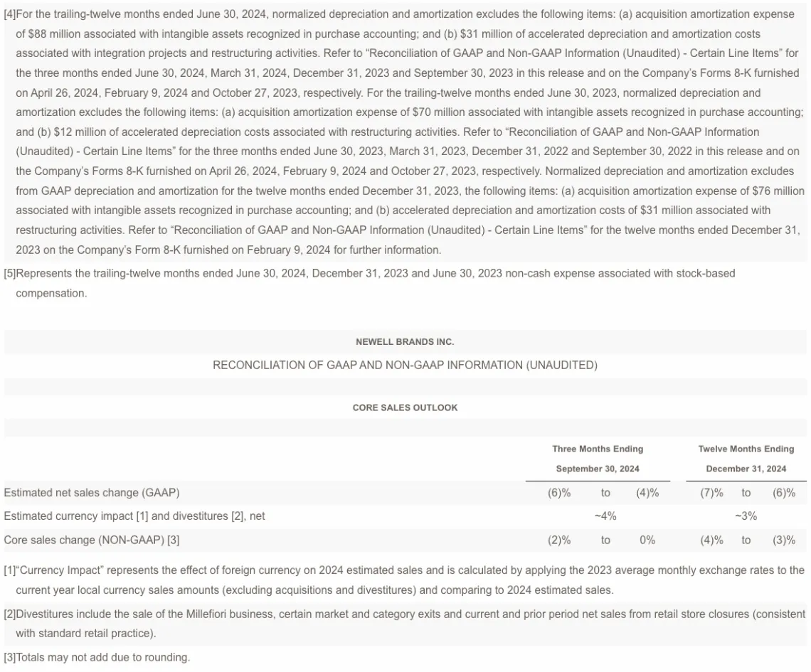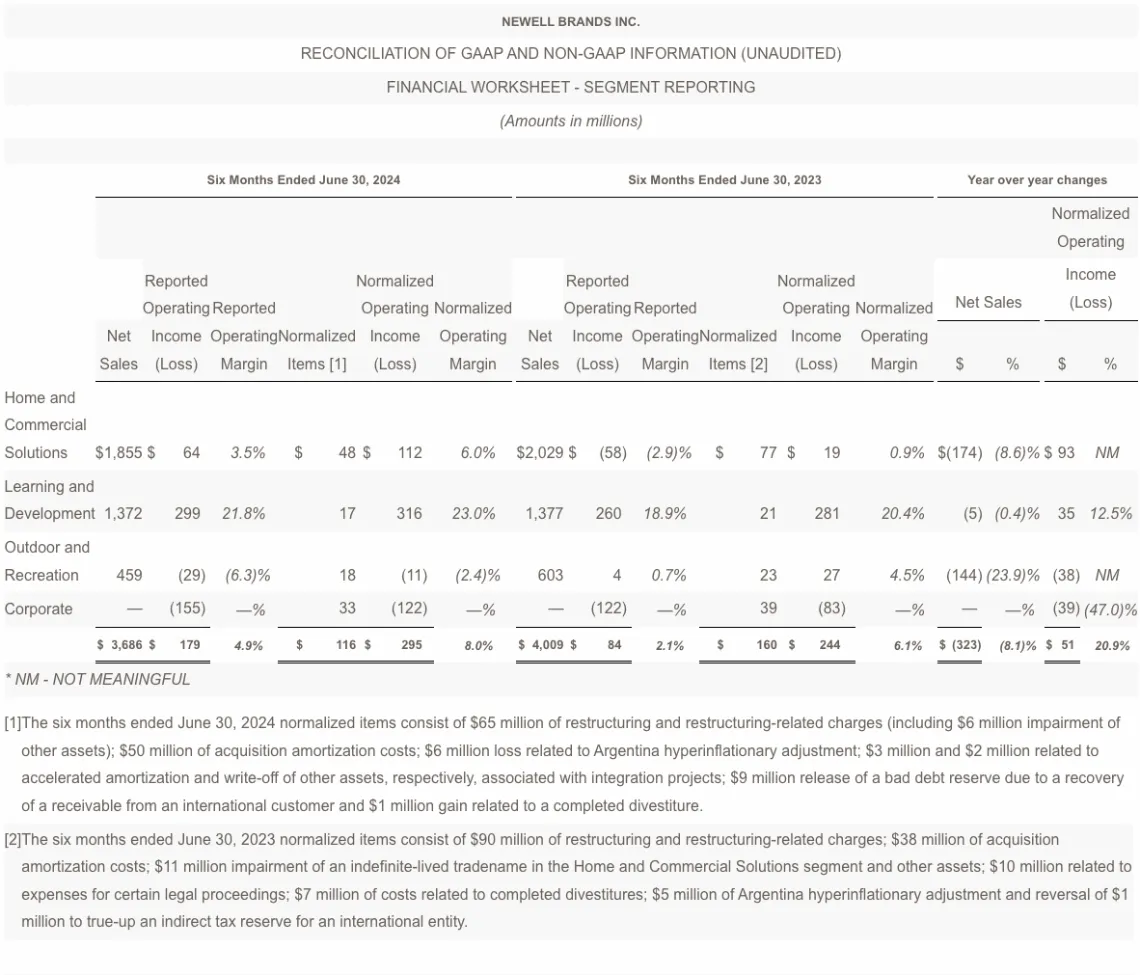 At the end of the second quarter, Newell Brands had debt outstanding of $5.0 billion and cash and cash equivalents of $382 million, compared with $5.4 billion and $317 million, respectively, at the end of the second quarter of 2023.